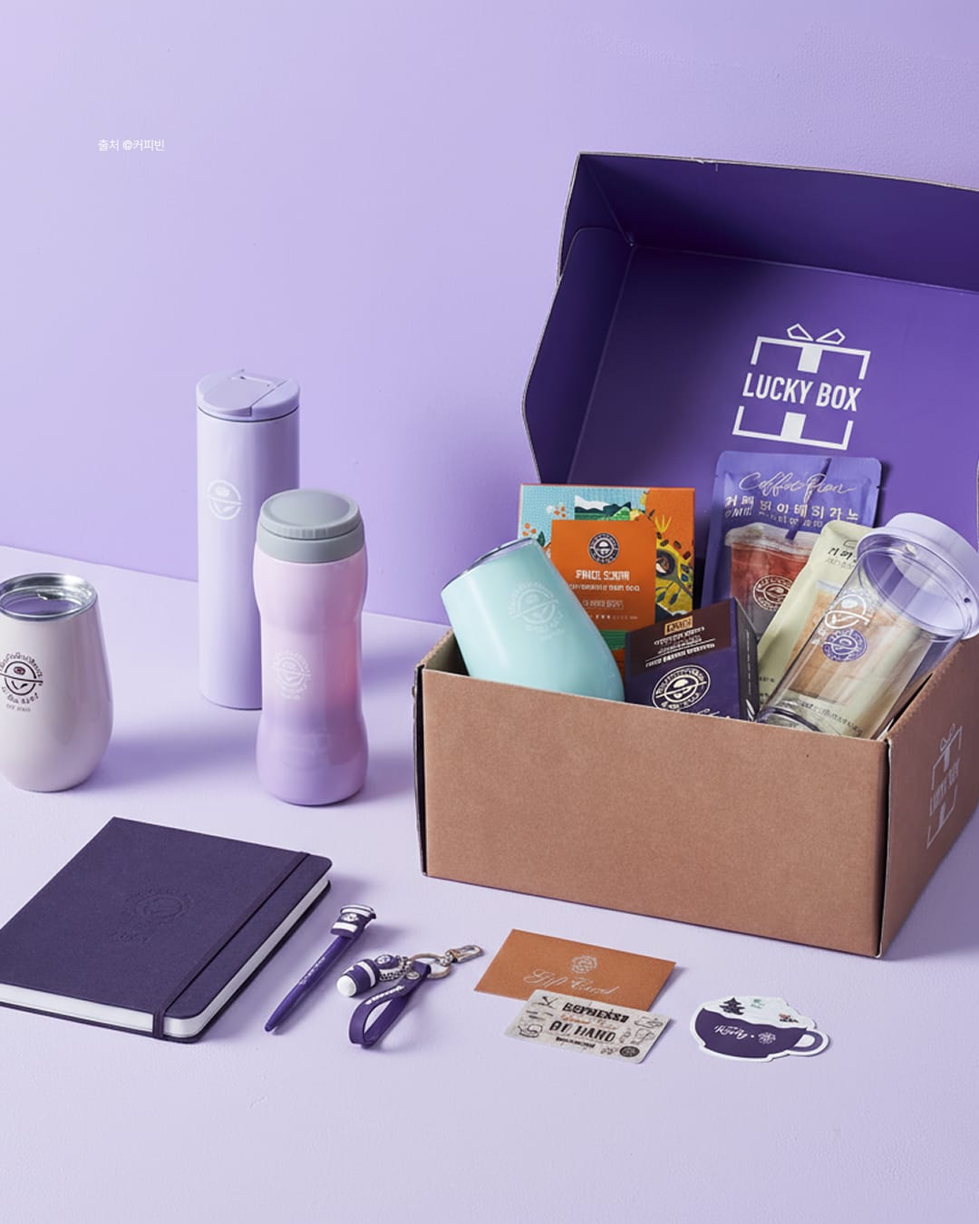 커피빈이 2021년 마켓컬리와 함께 선보인 커피빈X마켓컬리 럭키박스 패키지는 심플하면서도 브랜드의 고급스러움을 놓치지 않았습니다. 약 4만 원 상당의 자사 인기 MD상품을 랜덤 구성으로 담았고, 럭키박스 안쪽에는 두 브랜드의 시그니처 컬러인 퍼플 포인트를 더해 차분하면서도 세련된 인상을 완성했습니다. 골판지 G형 박스로 제작되어 깔끔한 형태감에 고급스러운 질감을 더했습니다.