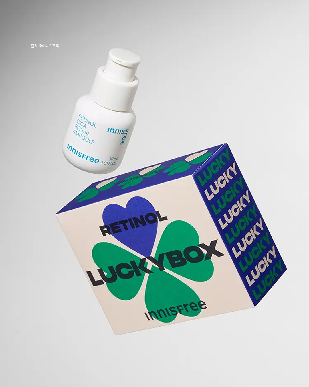 뷰티 업계는 트렌드에 민감한 만큼 럭키박스 이벤트를 가장 많이 활용하는 업계입니다. 이니스프리가 2024년 1월 출시한 '이니스프리 2024 럭키박스'는 성분별로 다른 키컬러를 사용하여 고객들이 선호하는 성분으로 구성된 럭키박스를 고를 수 있도록 유도했습니다. 행운을 상징하는 커다란 네잎 클로버와 함께 펑키하게 표현된 'lucky' 타이포그래피가 소비자들의 기대감을 자극합니다. 이니스프리의 럭키박스는 무게감 있는 화장품을 담기 적합한 골판지 단상자로 제작되었습니다.