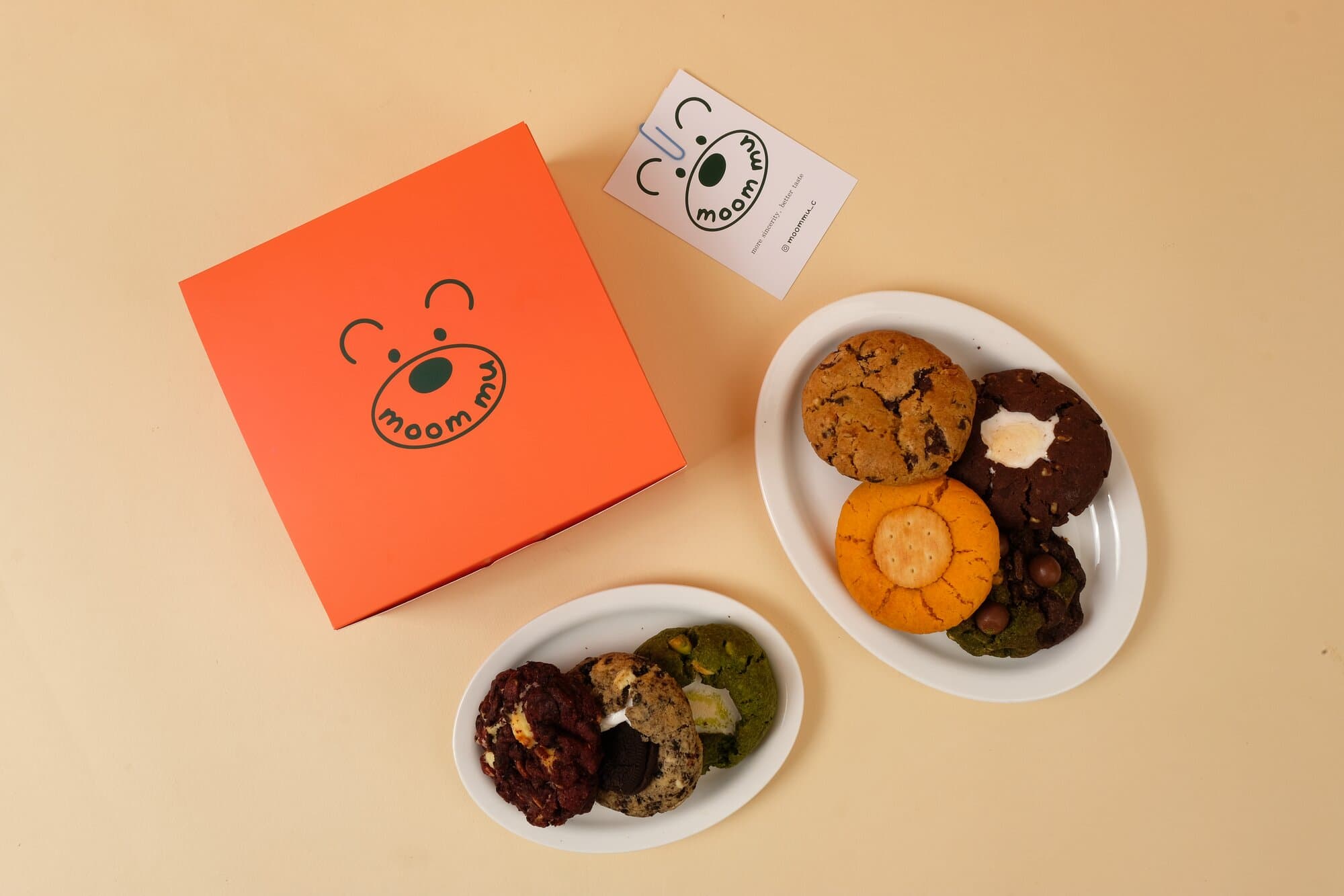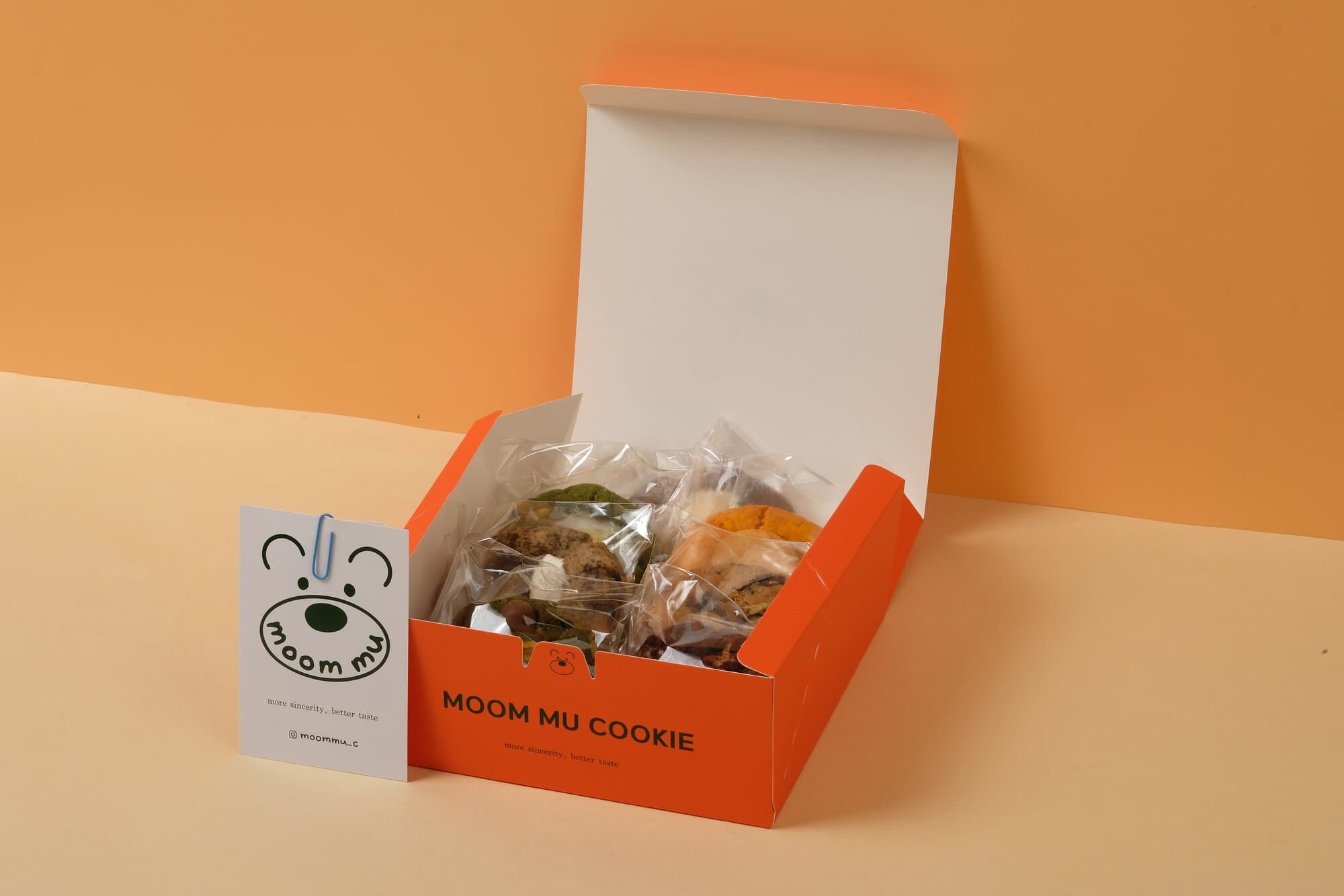 Printed in a single color for a clean look along with the cute logo, this cookie box from Moom Mu Cookie feels like a gift to the receiver.