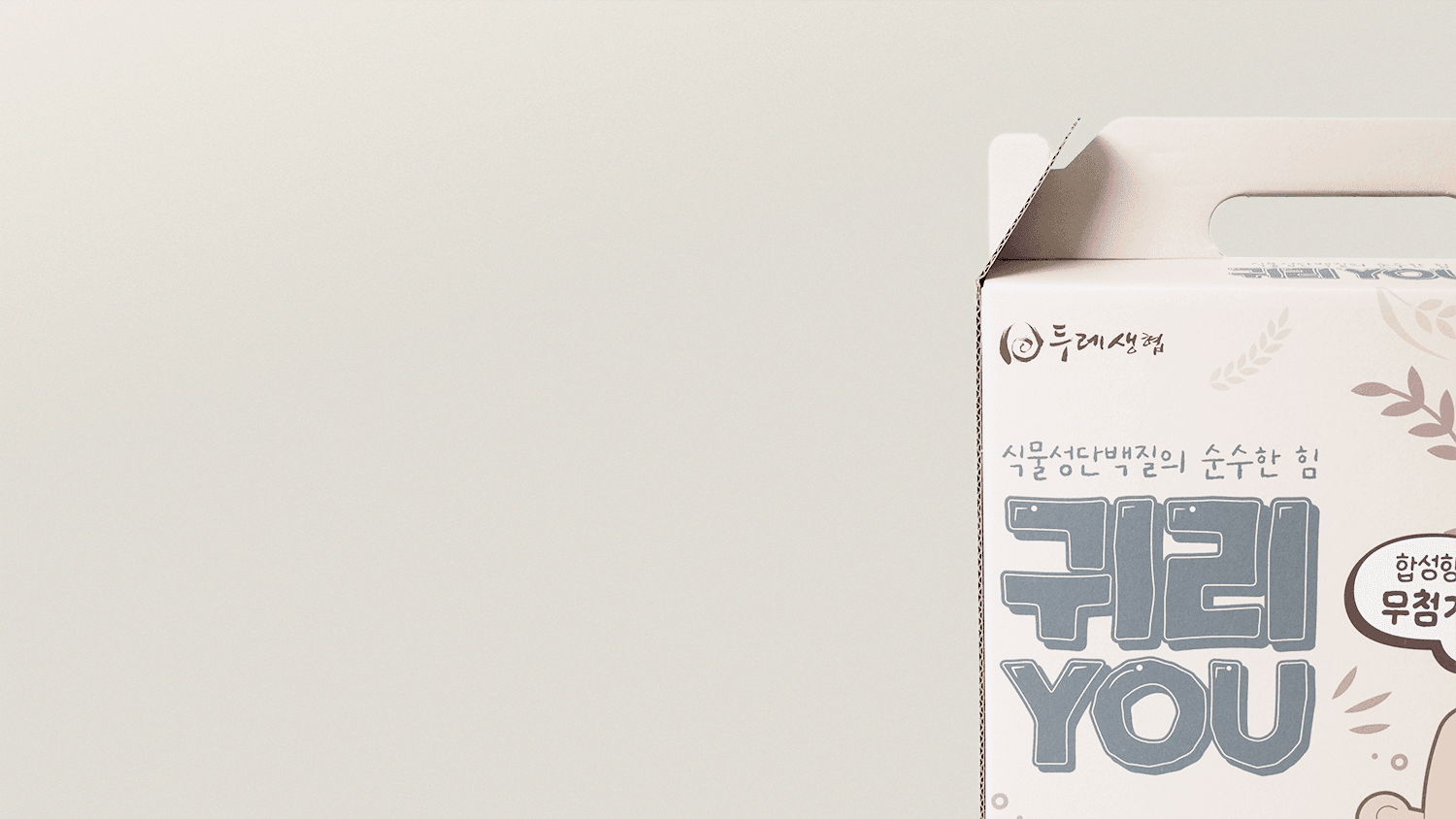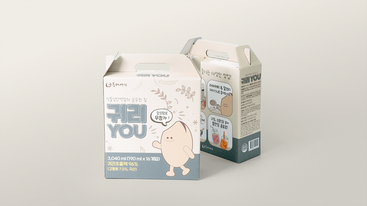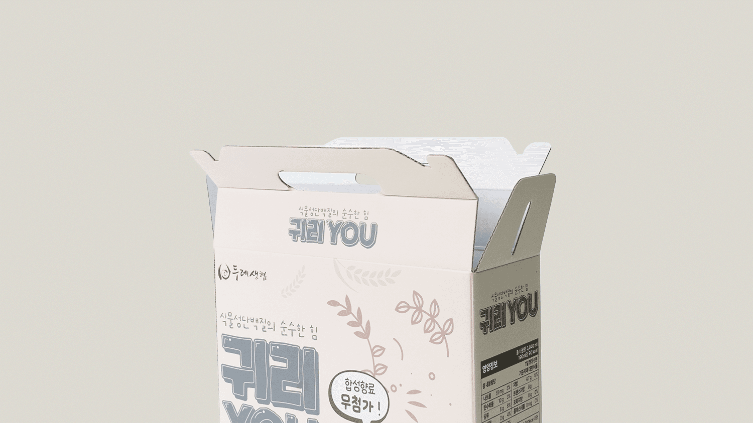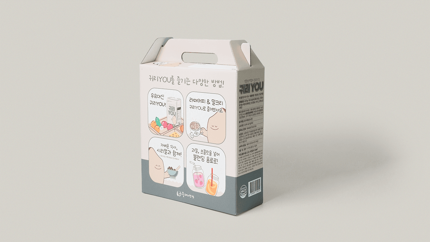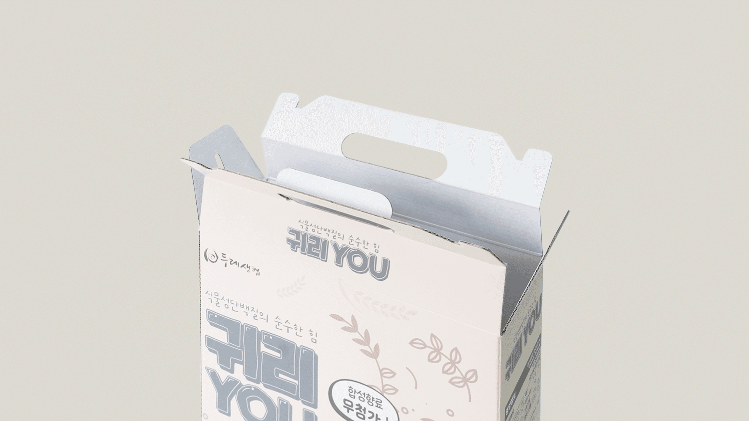 서로 돕는 협동정신을 바탕으로 소비자 조합원과 생산가가 모인 생활협동조합 '두레생협'의 유기농 귀리YOU 패키지 입니다. 신제품 귀리우유 정식 출시 전 매장 내 이벤트 용도로 활용하기 위해 실물에 가까운 경험을 제공하고자 실제 제품과 유사하게 제작되었습니다. 튼튼한 골판지 재질과 손잡이의 조화로 한약, 즙, 음료 등을 담기에 적합한 패키지 입니다.