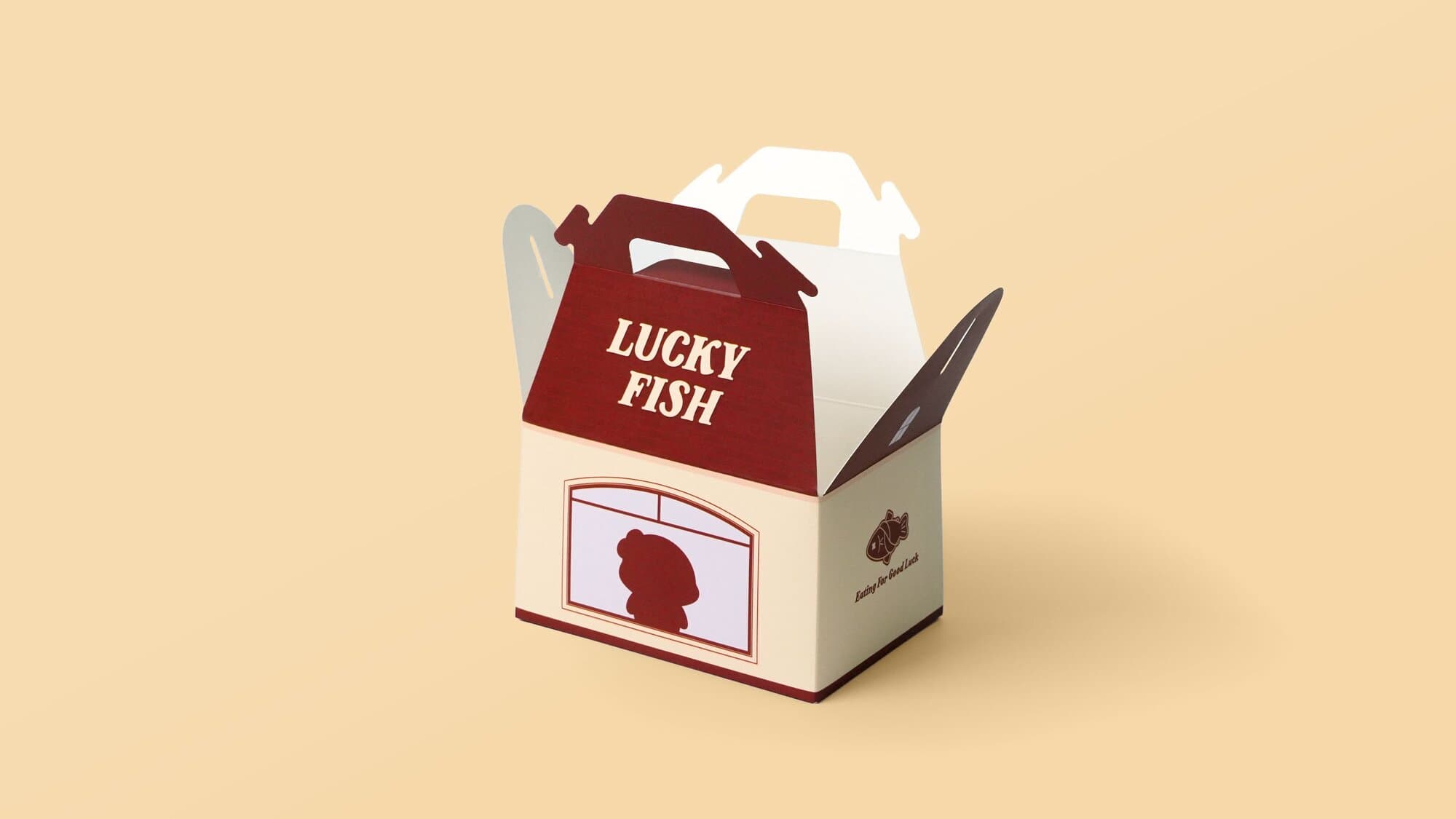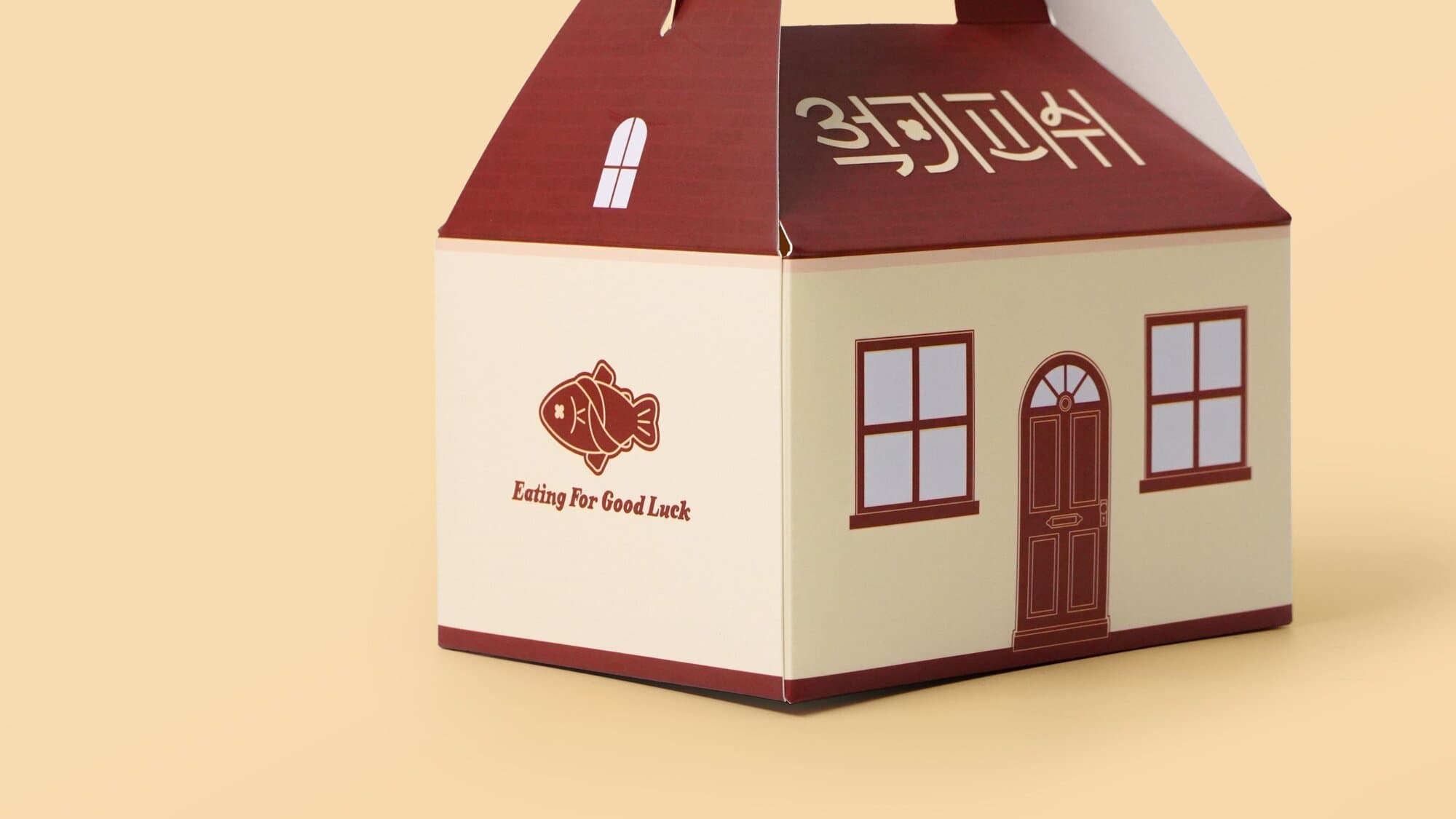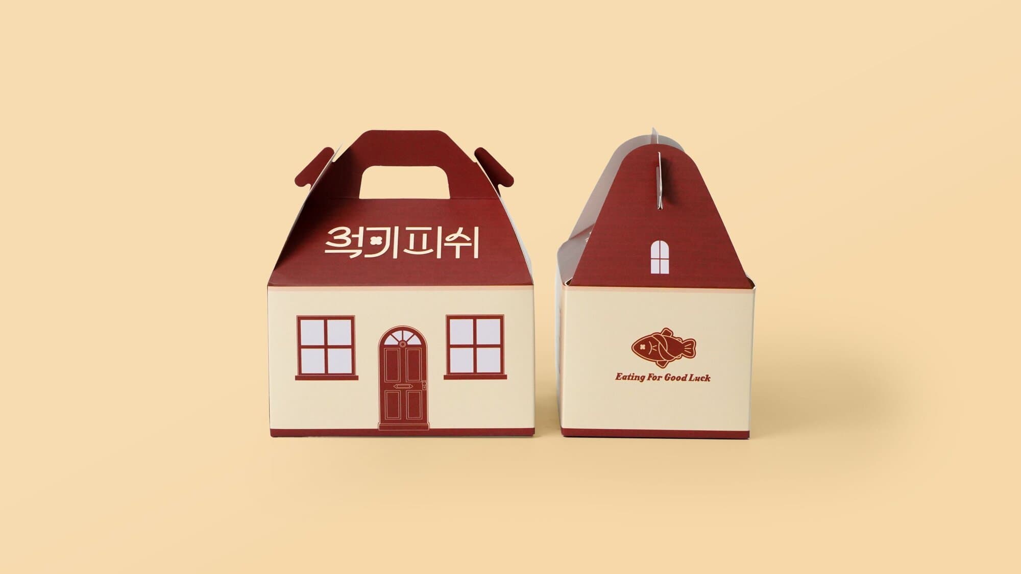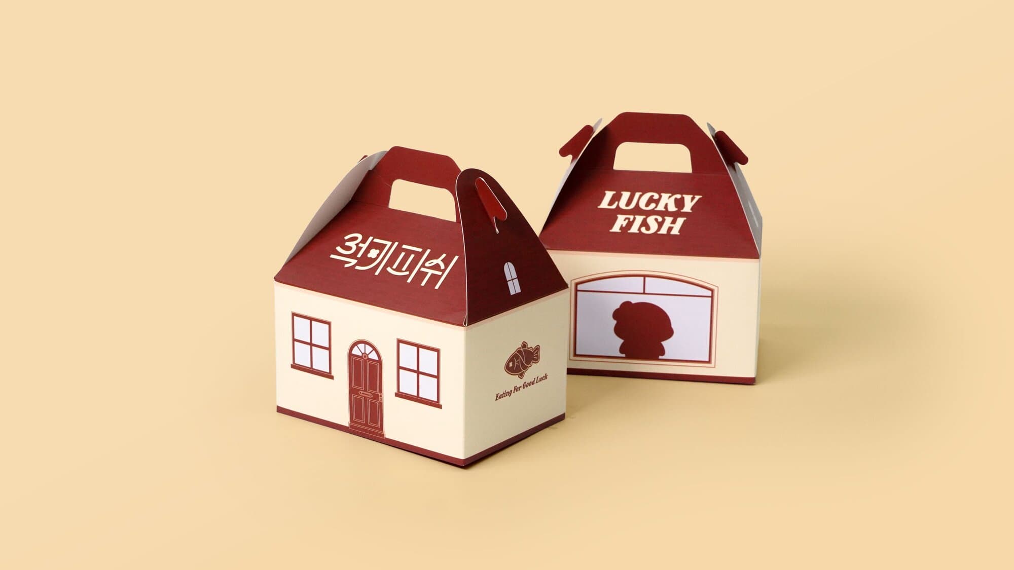 액막이 명태를 모티브로 한 디저트를 제작하고 판매하는 브랜드 럭키피쉬의 디저트 패키지입니다. 액막이 명태를 집 문 앞에 걸어두는 것에서 모티브를 가져와 집 형태로 패키지 디자인을 완성했고, 행운을 선물받은 듯한 느낌을 줄 수 있도록 윗면에 손잡이가 달린 손잡이박스로 제작했습니다.