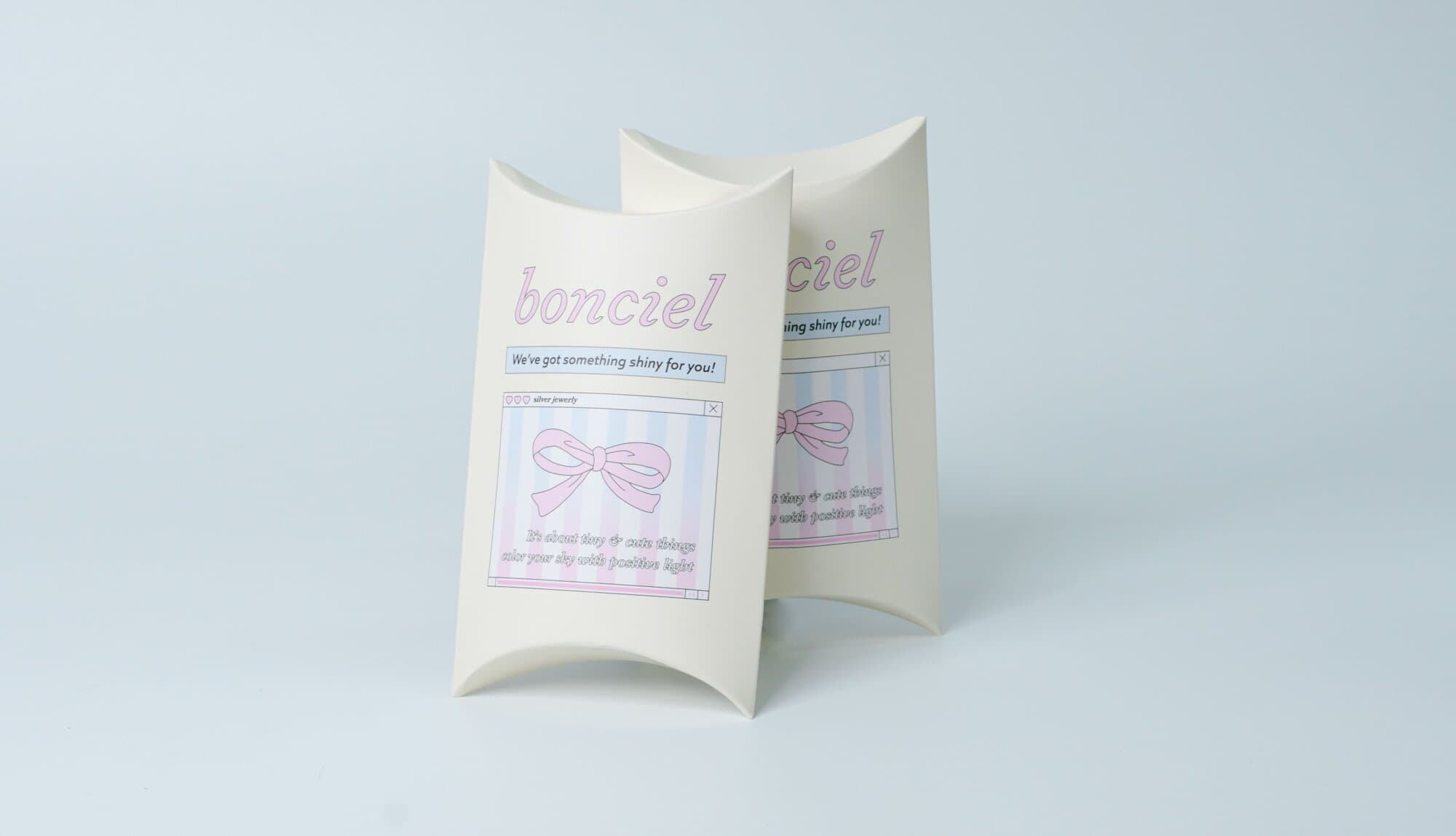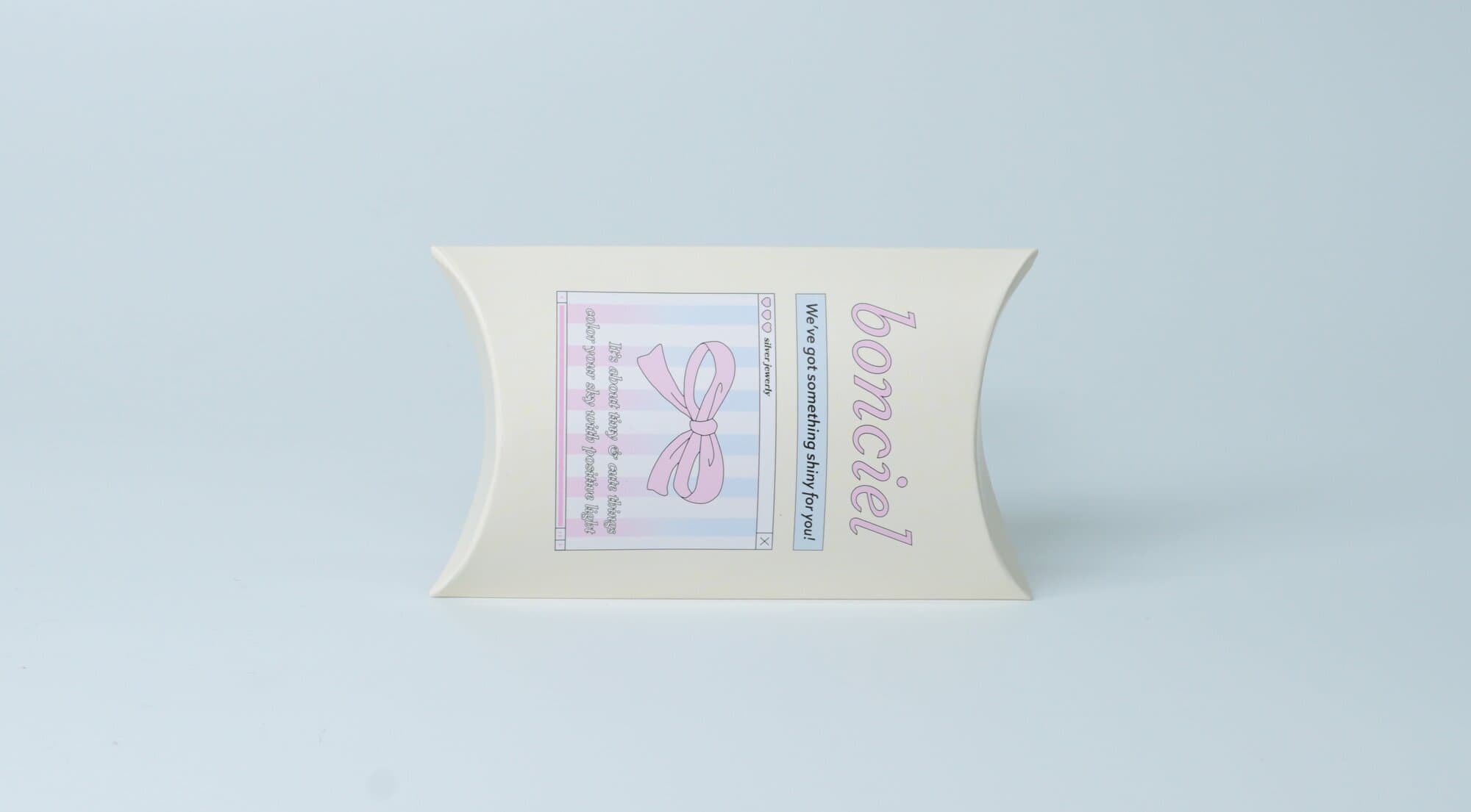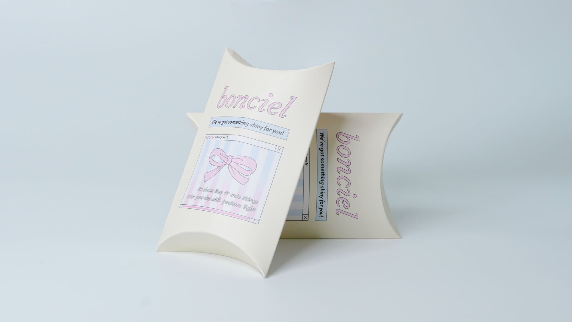 반짝이는 주얼리를 판매 중인 브랜드 본씨엘르의 반달상자 패키지입니다. 반달상자는 이름 그대로 반달 모양처럼 생겨 불리는 이름으로 오목상자라고도 합니다. 귀걸이, 팔찌, 목걸이 등의 소형 악세사리 포장 패키지에 적합한 패키지입니다.