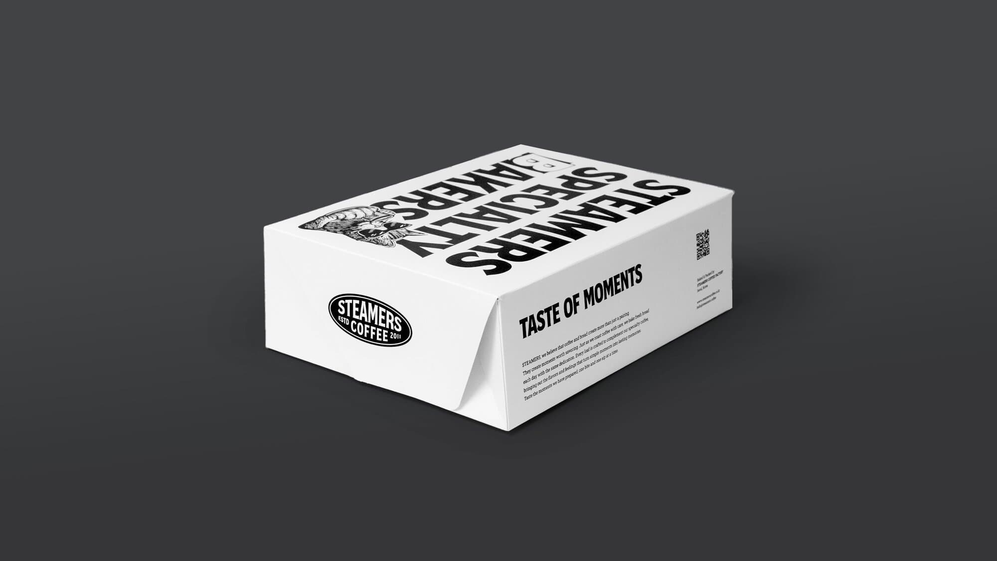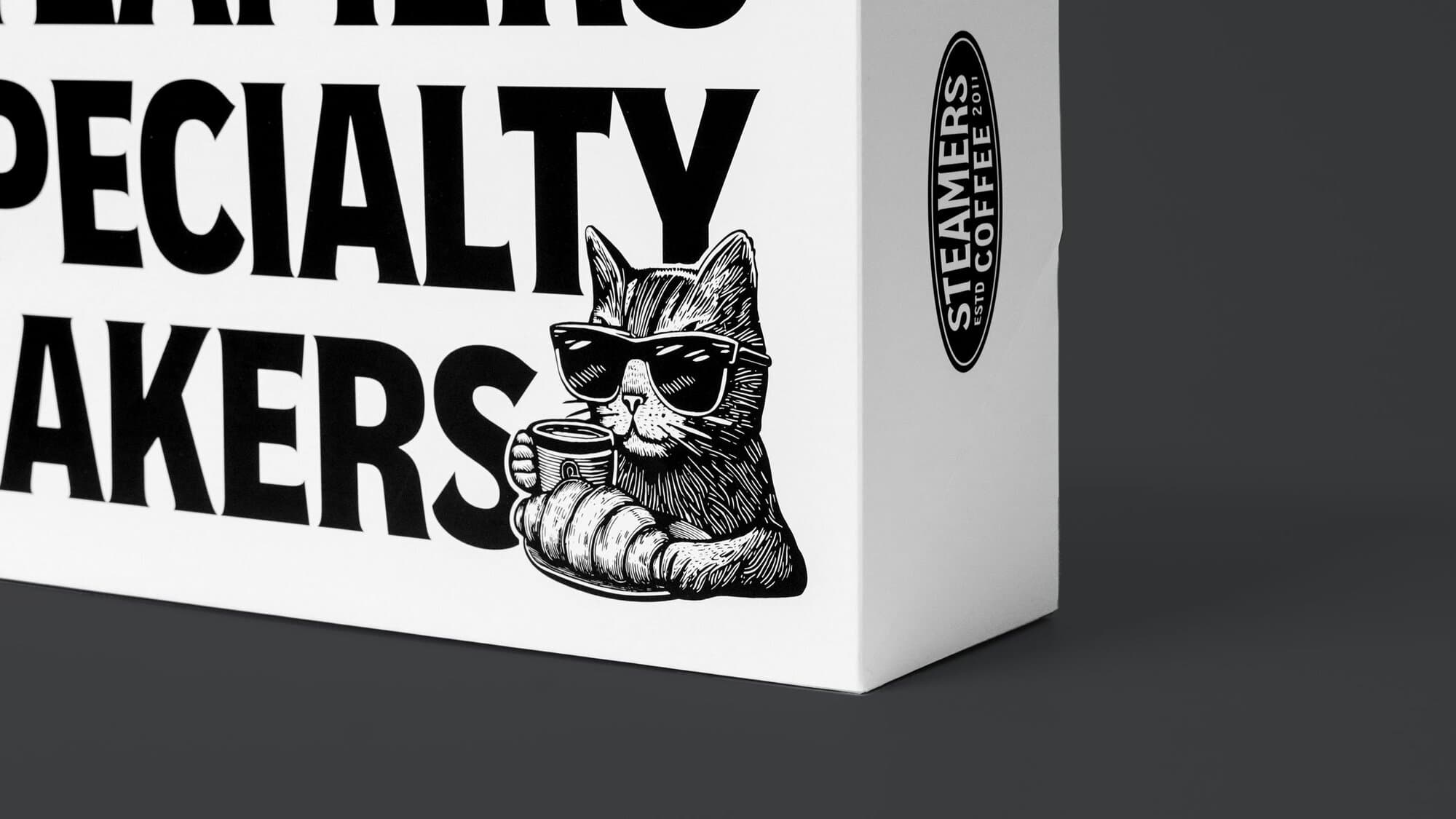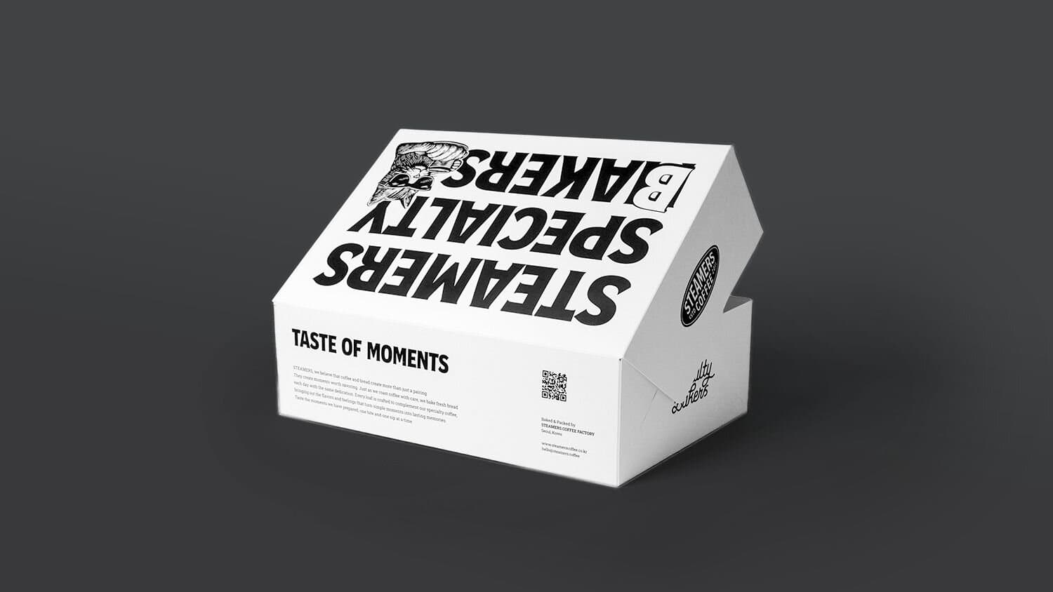 진심을 담아 커피 본연의 테이스트를 전하는 신사동 가로수길의 '스티머스 커피팩토리샵'의 베이커리 포장박스입니다. 먹 1도 인쇄와 타이포그래피, 그리고 힙한 고양이가 만나 화려한 디자인 없이도 브랜드의 톤과 분위기가 잘 전달되는 베이커리 포장용 도넛박스입니다.