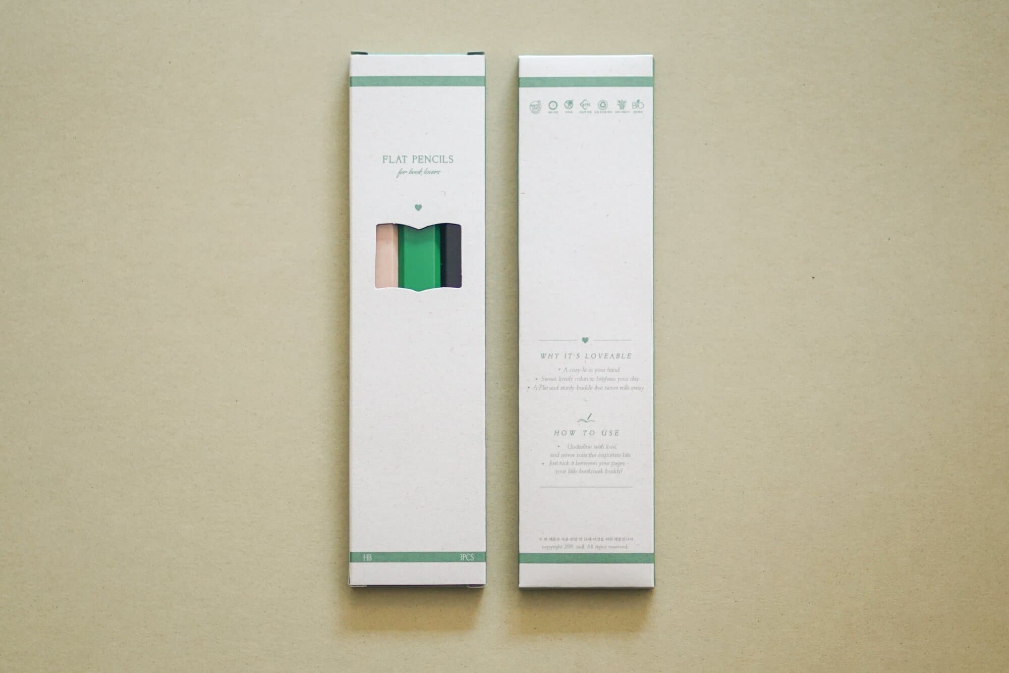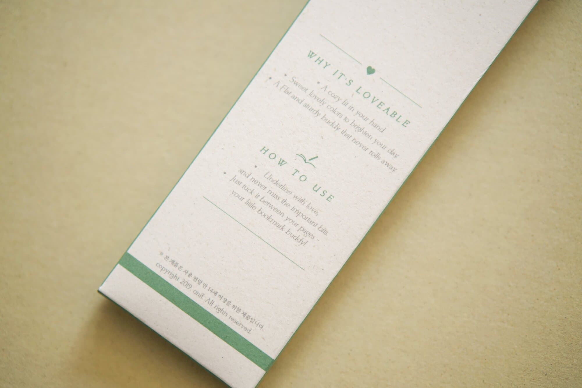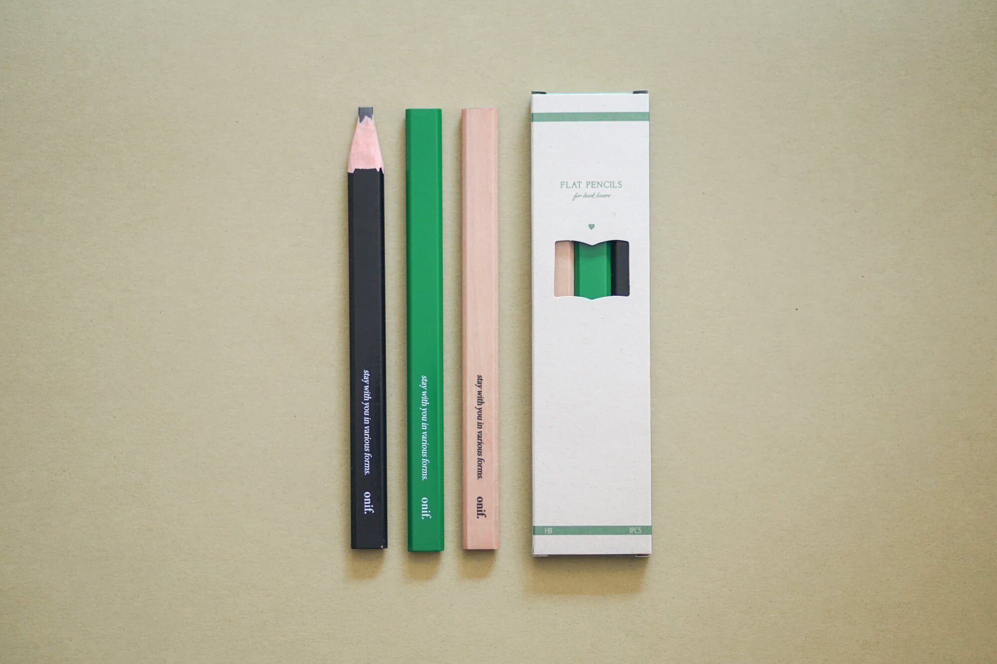 우리의 일상을 다정하게 채워주는 브랜드 '오니프(onif)'의 친환경 납작연필 패키지를 제작했습니다. 책 모양의 타공을 통해 3가지 색상의 납작연필이 드러나는 구조로, 100% 사탕수수 잔여물로 만들어진 얼스팩 지류를 사용해 제작된 생분해성 친환경 패키지입니다.