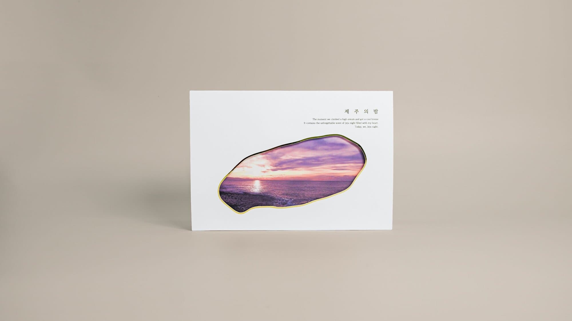 처음 열었을 때 느껴지는 만다린의 상큼한 향과 곧이어 따라오는 자연스러운 비누 향이 방안을 따뜻한 분위기로 만들어줍니다. 감성적인 제주의 느낌을 패키지에서도 느낄 수 있게 바다가 보이도록 구멍을 낸 슬리브를 제작했습니다. 슬리브 안에는 방향제 유리병을 단단히 잡아 줄 수 있도록 G형 박스를 만들어 조립하였습니다.
