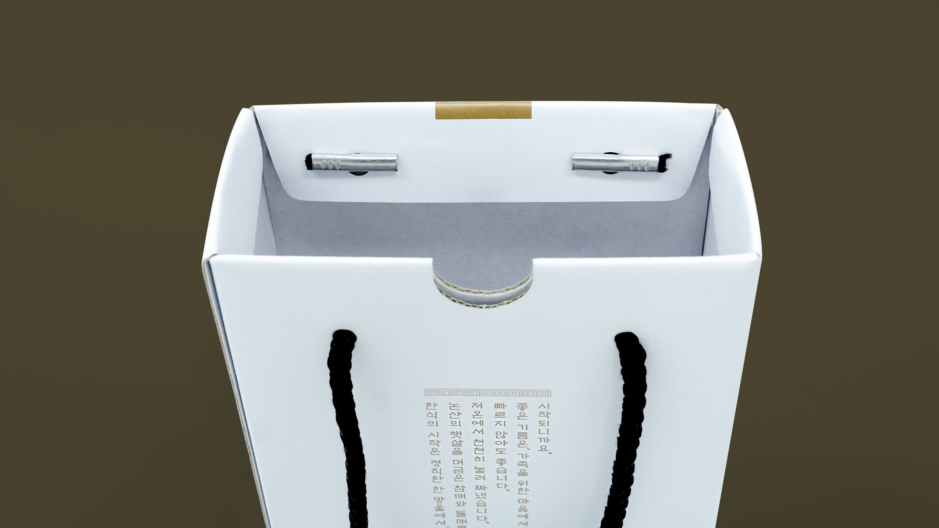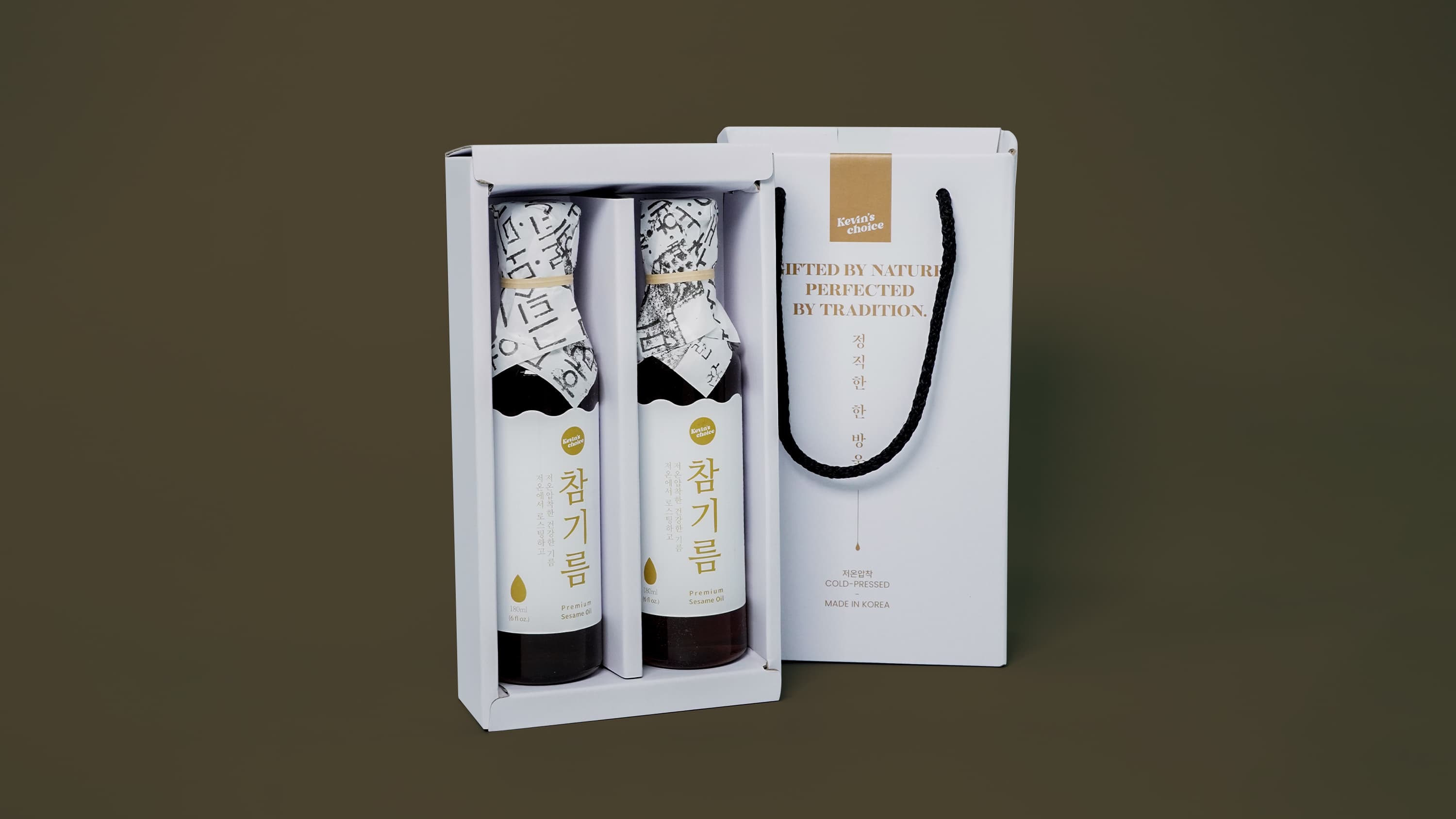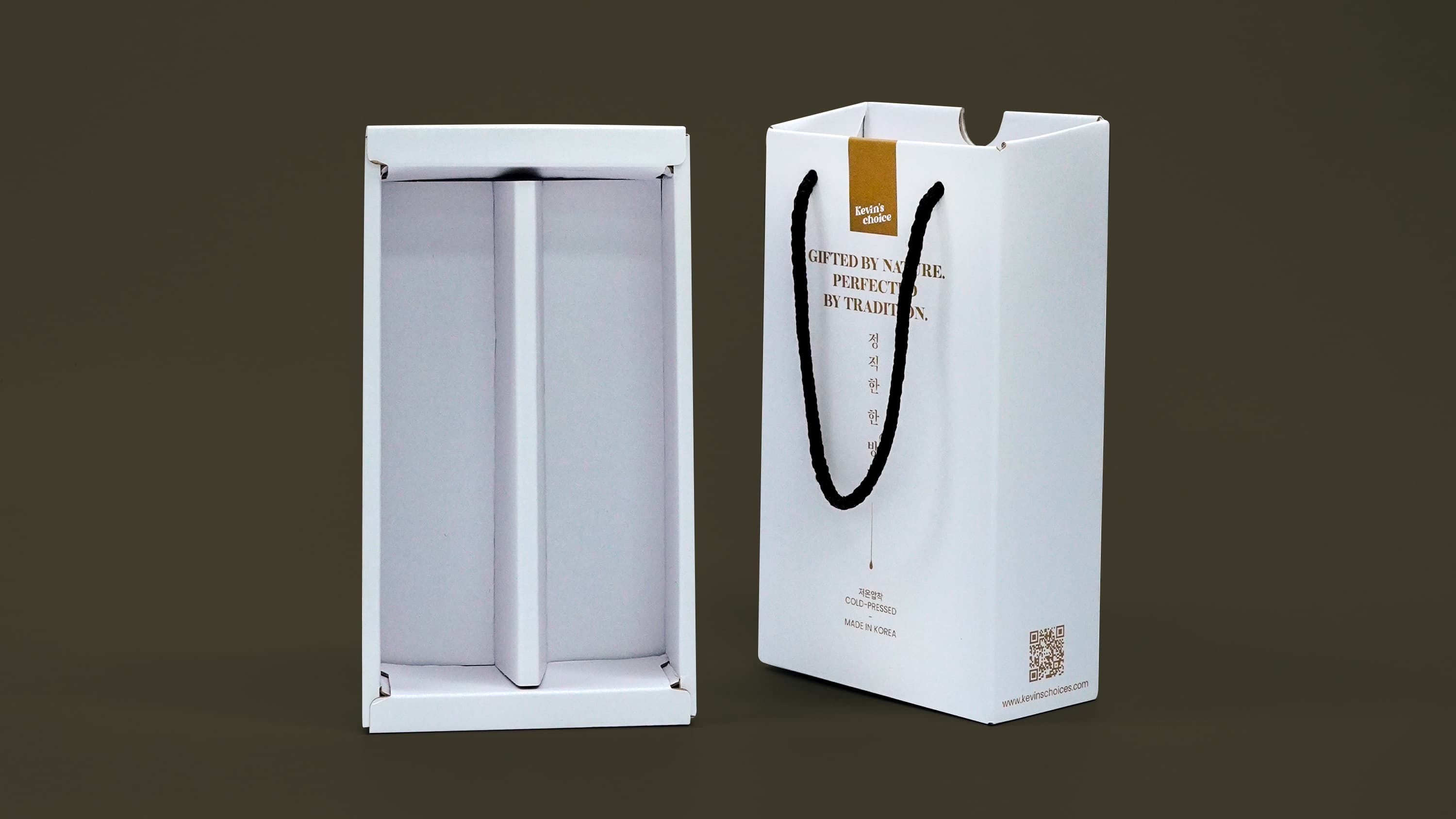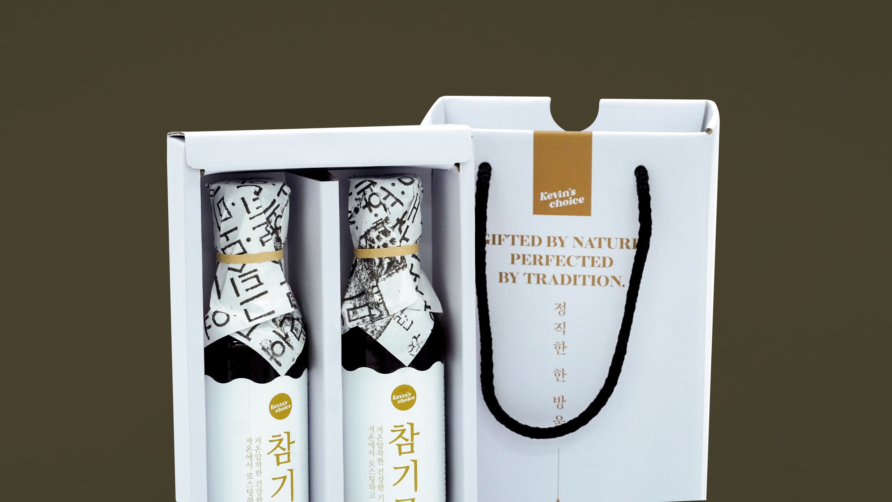 커인터내셔널의 참기름 패키지는 슬리브와 끈 디테일을 더한 골판지 쇼핑백 박스 형태로 제작되어, 제품 보호와 선물용 연출을 동시에 만족시키는 구성이 특징입니다. 무광코팅과 4도 인쇄로 깔끔한 브랜드 인상을 살렸으며, 참기름·오일류처럼 병 제품을 담는 식품 선물세트 포장에 잘 어울리는 패키지입니다.