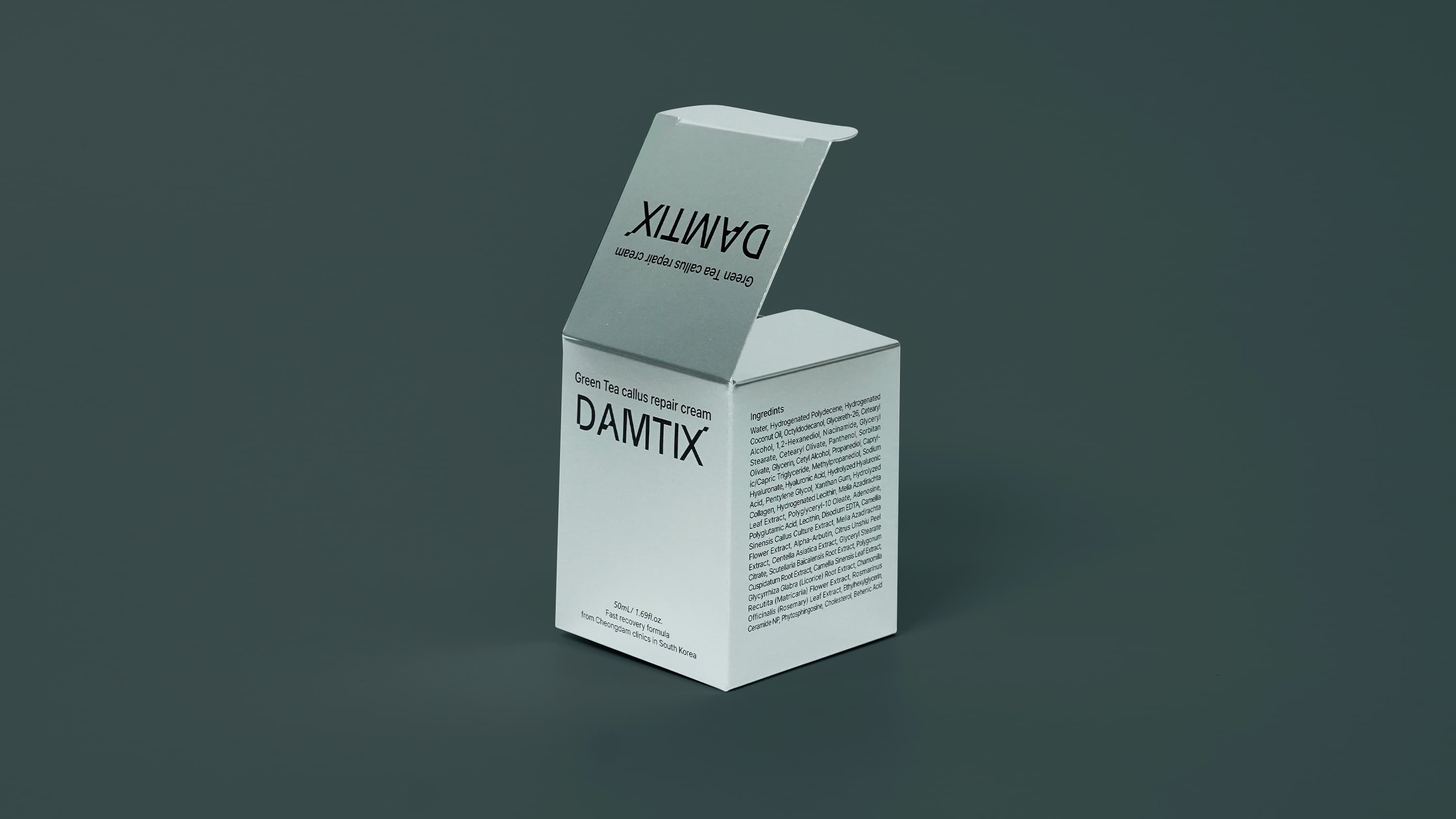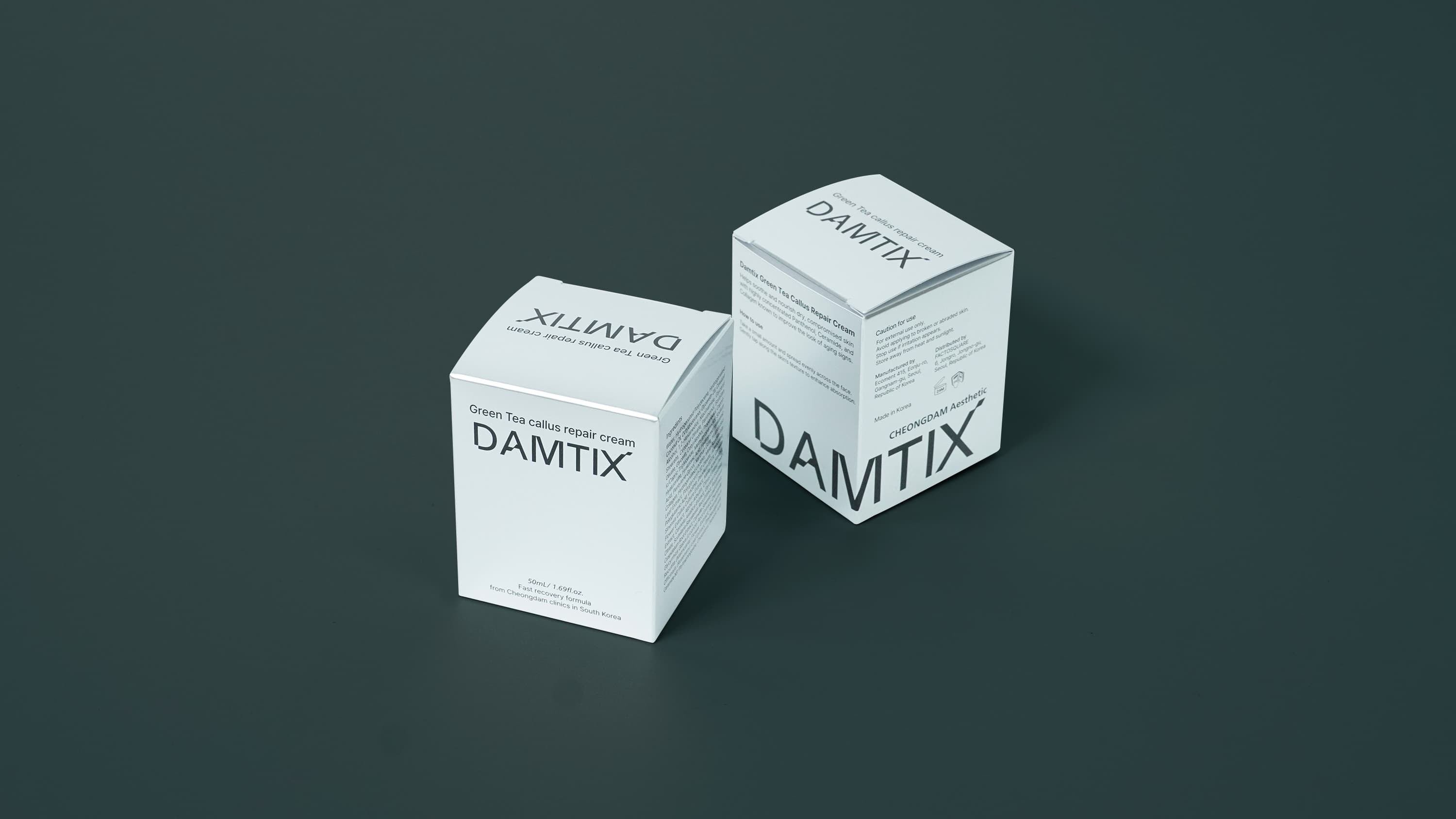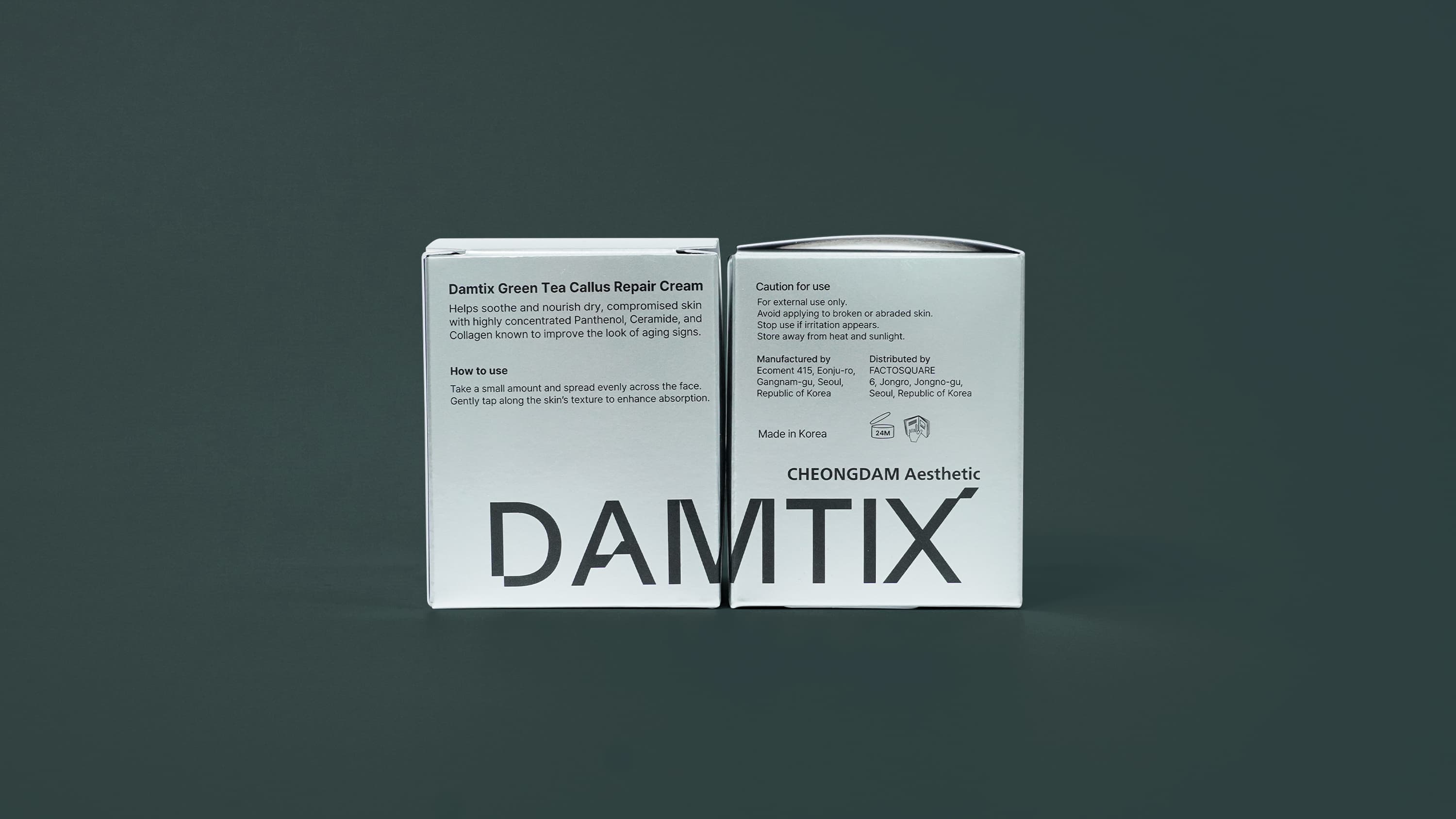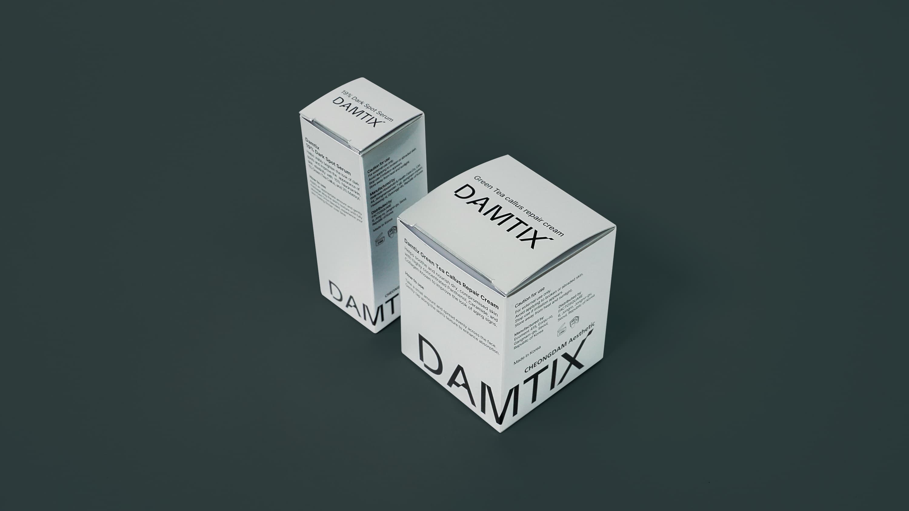 담틱스 x 팩토스퀘어의 NMN 세럼 패키지는 은증착 후가공을 더한 종이 단상자로 제작되어, 세럼 제품의 프리미엄 이미지를 효과적으로 강조합니다. 뷰티팩 350g 지류에 유광코팅과 먹 1도 인쇄를 적용해 절제된 디자인 속에서도 금속성 광택이 돋보이며, 고급 화장품 패키지에 어울리는 완성도를 보여줍니다.