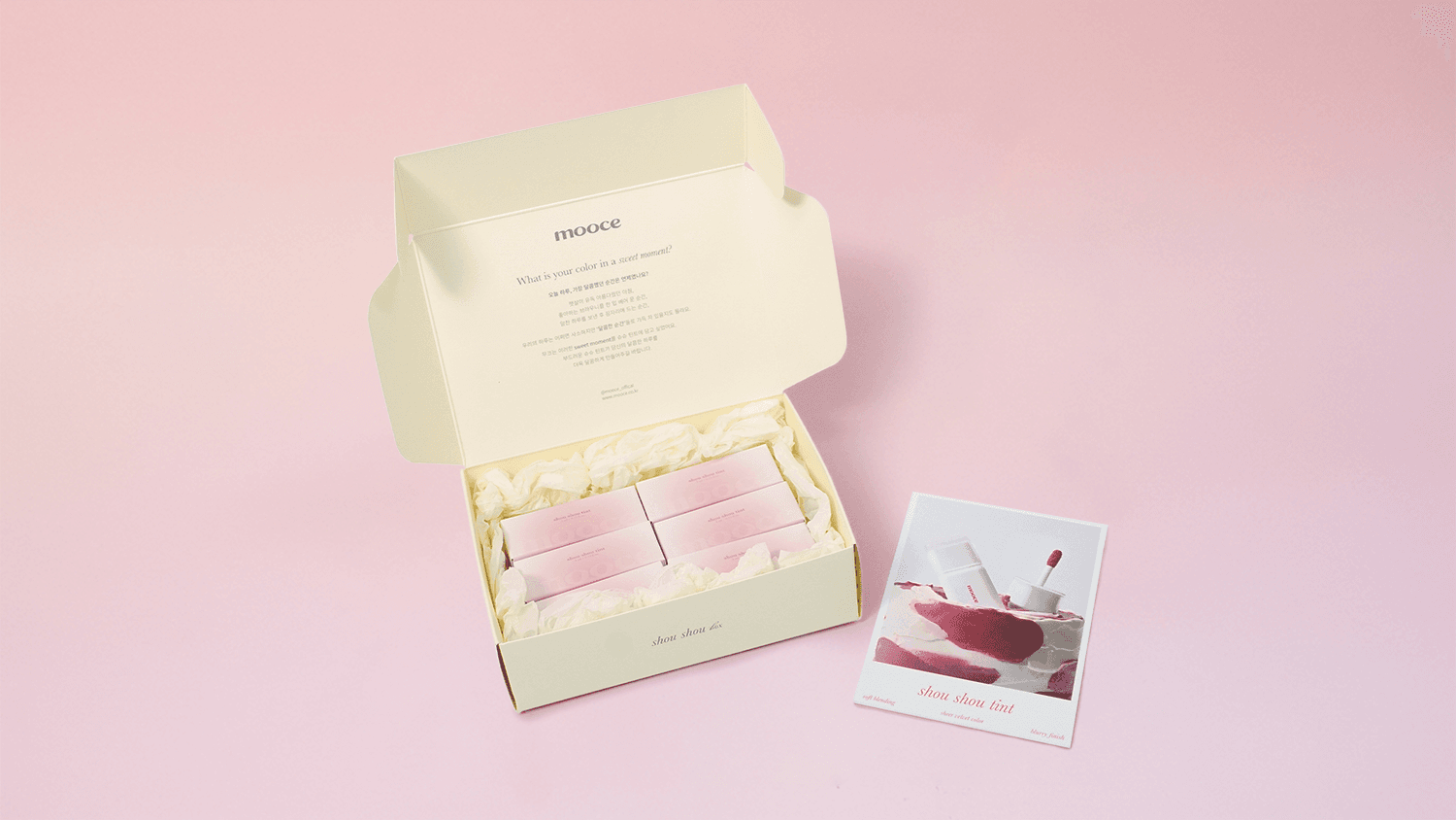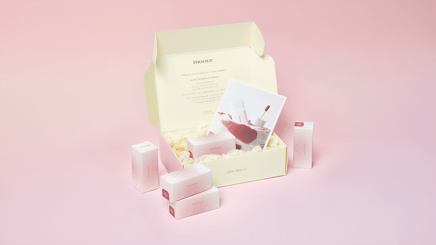 cycosmetics의 틴트 시딩박스는 브랜드 컬러와 제품 콘셉트를 인상적으로 전달할 수 있도록 기획된 시딩 패키지입니다. AB 400g 지류에 양면 무광코팅, 양면 별색 2도와 먹 1도 인쇄, 형압 후가공을 적용해 시각적 완성도를 높였으며, 뷰티 PR 박스나 인플루언서 시딩박스로 활용하기 좋은 패키지입니다.