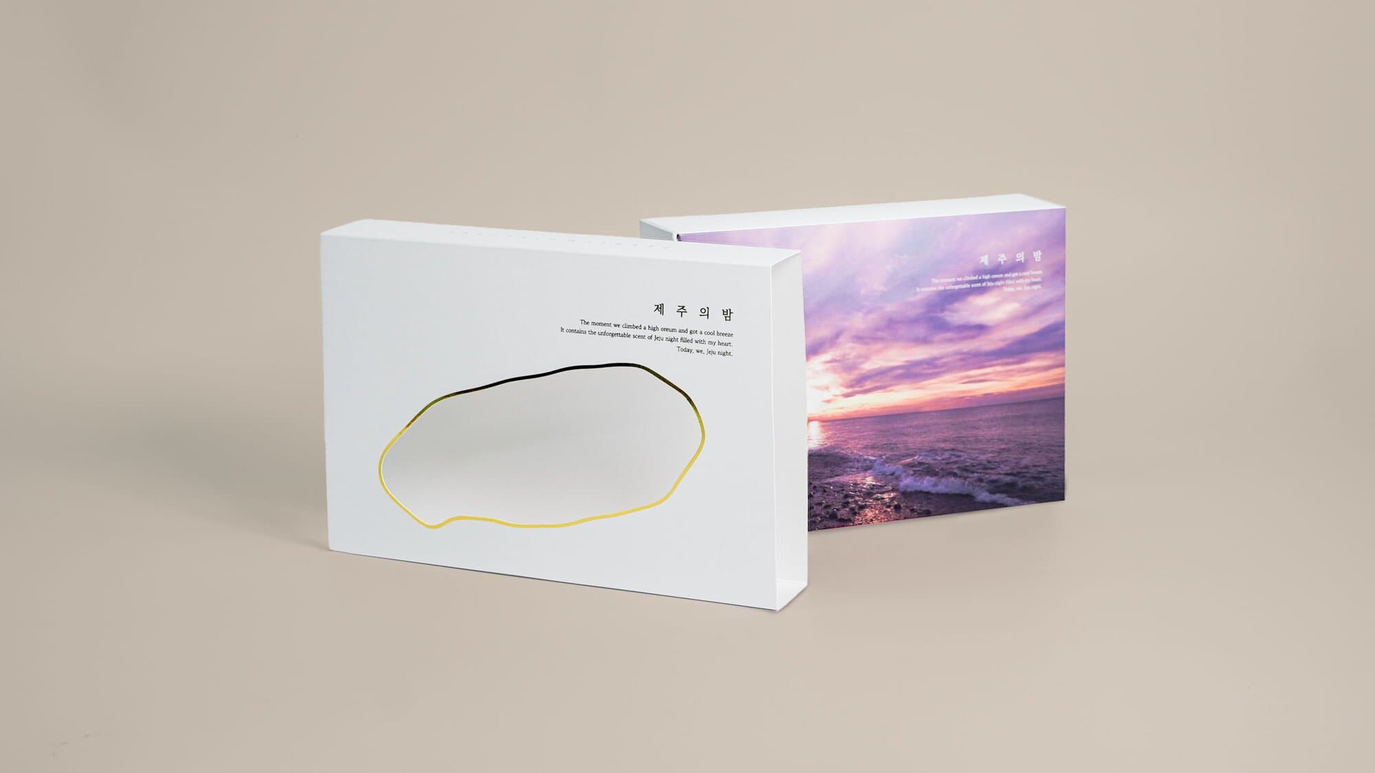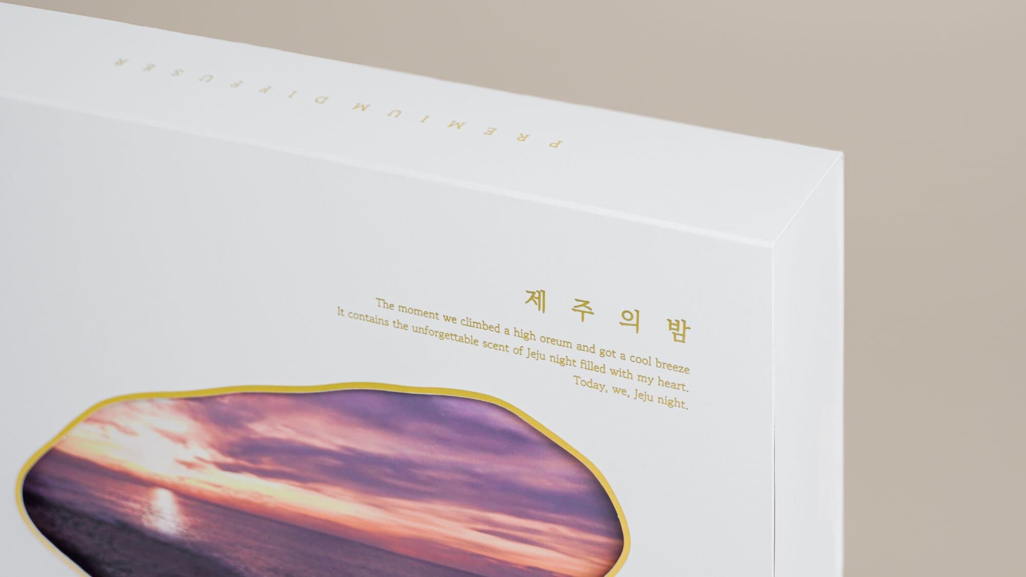 처음 열었을 때 느껴지는 만다린의 상큼한 향과 곧이어 따라오는 자연스러운 비누 향이 방안을 따뜻한 분위기로 만들어줍니다. 감성적인 제주의 느낌을 패키지에서도 느낄 수 있게 바다가 보이도록 구멍을 낸 슬리브를 제작했습니다. 슬리브 안에는 방향제 유리병을 단단히 잡아 줄 수 있도록 G형 박스를 만들어 조립하였습니다.
