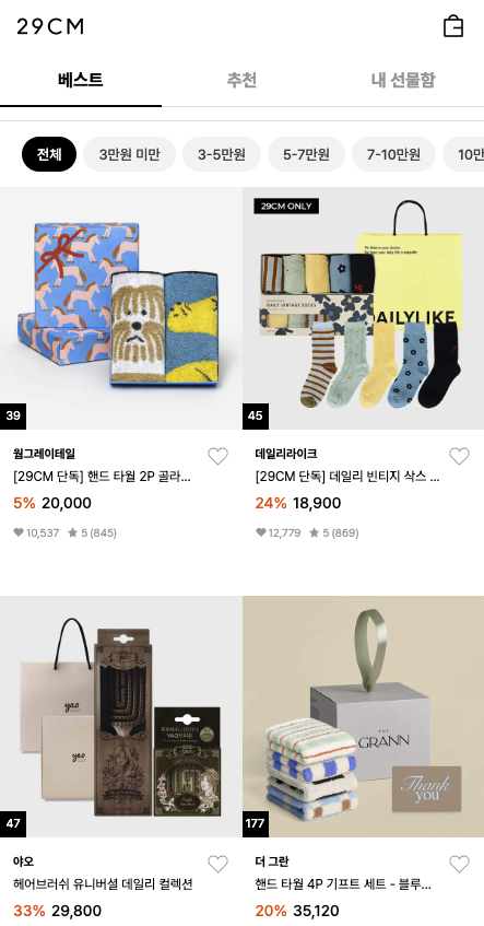 29cm, 카카오톡 선물하기 등 선물하기 서비스에 입점한 브랜드라면, 주목도를 높이기 위해 제품 썸네일에 예쁜 패키지 디자인을 함께 강조하는 배치를 활용해보실 수 있습니다. 실제로 선물하기 서비스들에 노출된 상품들을 보면 쇼핑백과 함께 구성해 '선물용 패키지'임을 자연스럽게 강조하는 경우가 많습니다. 이런 방식은 고객이 상품을 보는 순간 선물을 주고받는 장면을 바로 연상하게 한다는 점에서 효과적입니다.