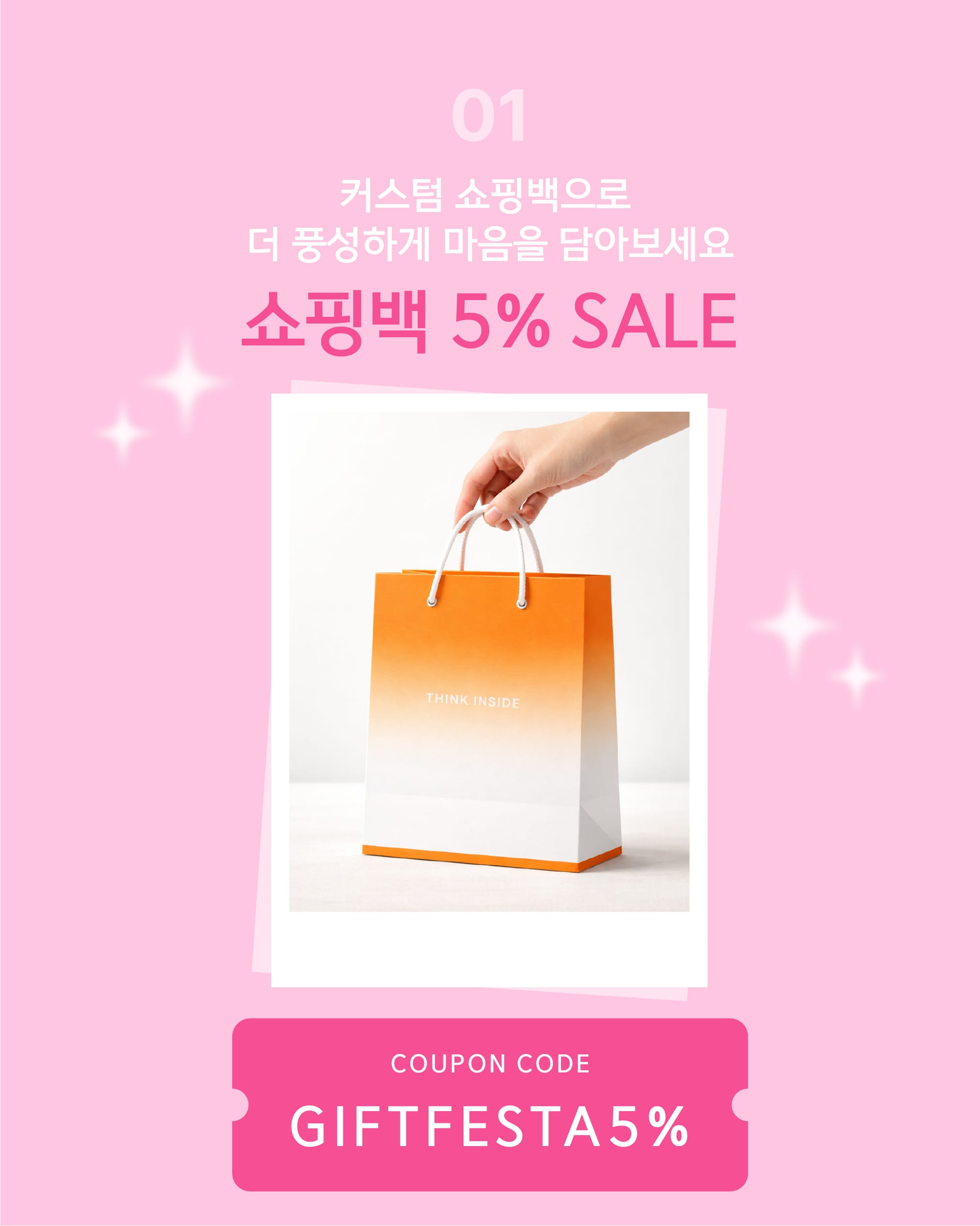 기프트 패키지 페스타 기간 동안 쇼핑백을 주문하시면 5% 할인 혜택을 받으실 수 있습니다. 선물포장박스와 쇼핑백을 함께 준비하고 싶은 브랜드라면, 이번 기간에 세트로 주문해 보다 합리적으로 패키지를 제작해보세요.