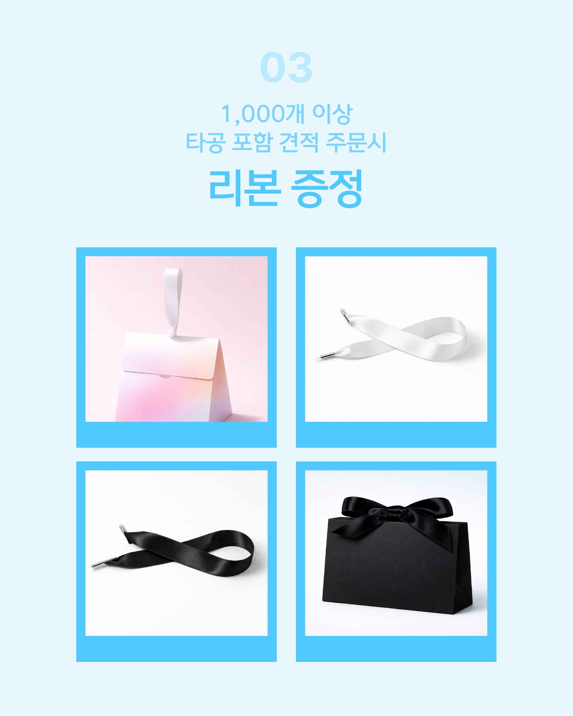 대량 주문을 계획하고 계시다면 리본 증정 혜택도 놓치지 마세요. 1,000개 이상(타공 포함) 박스를 견적 문의를 통해 주문하실 경우 이벤트 기간 동안 공단 끈 리본을 무료로 증정해드리고 있어, 부자재까지 선물 패키지를 한 번에 준비하실 수 있습니다.