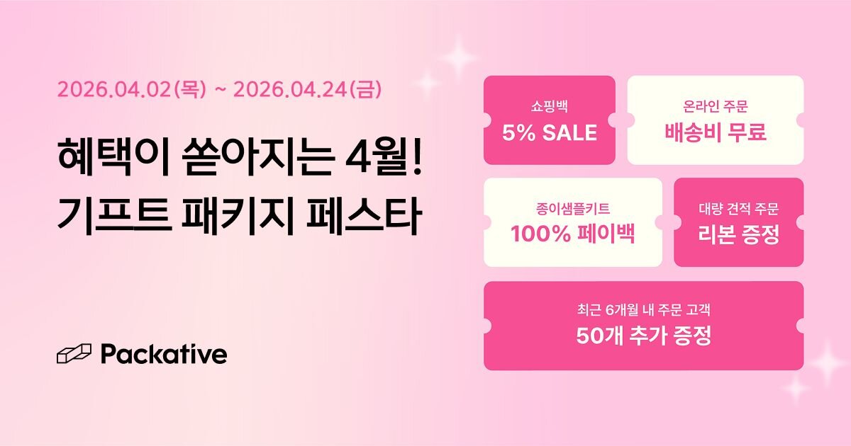 그래서 패커티브가 4월 2일부터 24일까지 '기프트 패키지 페스타'를 준비했어요! 선물용 박스 제작과 함께 쇼핑백 할인, 무료 배송, 종이샘플 페이백, 단골 추가 증정까지 꼭 필요한 혜택들을 한 번에 정리해드릴게요.